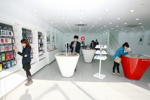 전시대 중앙과 벽면 하부 수납장 위에는 십여명 이상 동시 이용할 수 있는 여러 종류의 충전기가 설치돼 있다. 또한 최근 고객 수요가 급증하고 있는 스마트폰 액세서리도 구비돼 있다.
