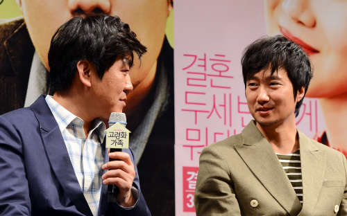 | 배우 윤제문(왼쪽)과 박해일이 8일 압구정 CGV에서 열린 영화 고령화가족 제작발표회에서 무언가 이야기를 나누고 있다. 사진=김재원 기자 jkim@sportsworldi.com 2013.4.8 |