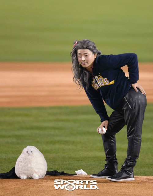| 개그맨 김준호가 29일 잠실구장에서 열린 두산과 삼성의 한국시리즈 5차전에 앞서 시구를 하고 있다. 잠실=김두홍 기자 kimdh@sportsworldi.com |