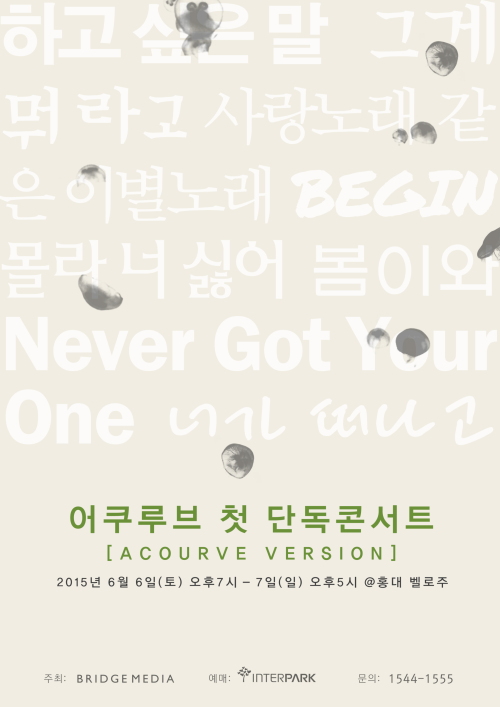 20~30대의 현실적인 사랑 이야기를 어쿠스틱한 사운드로 노래하는 어쿠루브의 첫 단독 콘서트 ‘어쿠루브 버전’은 6월 6일부터 6월 7일 까지 홍대 벨로주에서 공연되며, 오는 21일 화요일 2시 온라인 예매 사이트 인터파크에서 티켓오픈 된다.