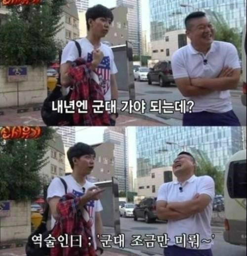 이어 이승기는 "내년에 군대에 간다고 했더니 미루라더라. 그래서 '내년에 군대 아니면 교도소 중 하나는 가야 한다'고 답했다"라고 말해 웃음을 자아냈다.