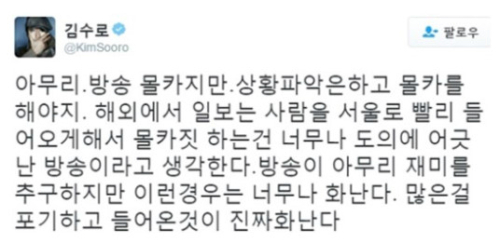 10일 김수로는 자신의 SNS에 “아무리 방송 몰카(몰래카메라)지만 상황 파악은 하고 몰카를 해야지. 해외에서 일보는 사람을 서울로 빨리 들어오게 해서 몰카 하는 건 너무나 도의에 어긋난 방송이라고 생각한다"는 글을 게재했다.
