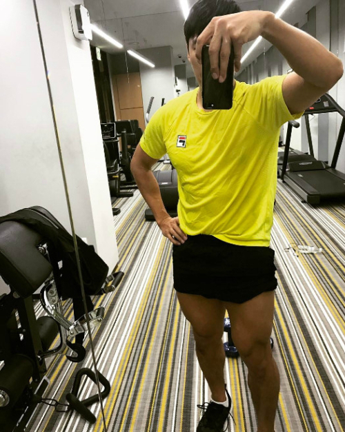 공개된 사진 속 그는 땀으로 흠뻑 젖은 티셔츠와 튼실한 허벅지가 돋보이는 모습이다.