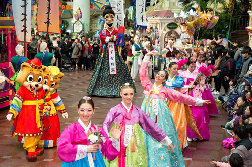 100여 명이 넘는 연기자와 수백 명의 관객들이 함께 하는 초대형 참여형 공연 ‘까치까치 설날’(1일 1회, 오후 3시 30분 공연)은 설 연휴 기간의 하이라이트다. 어드벤처 내 가든 스테이지에서 흥겨운 사물놀이와 역동적인 상모 돌리기 그리고 화려한 부채춤으로 채워진 공연이 절로 어깨를 들썩이게 한다. 분위기가 절정에 이르면 신명 나는 우리 가락과 함께 모든 연기자와 관객들이 행운의 박을 터뜨리며 한 해 복을 기원한다.